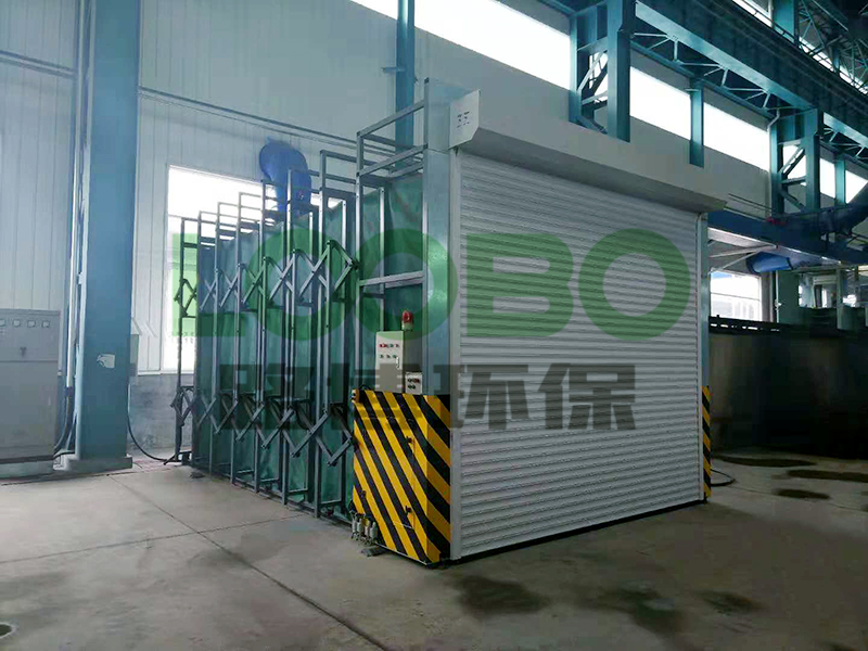 鍛壓廠鍛造壓機(jī)火焰切割機(jī)橫梁伸縮有效行程5m,升降有效行程3m,其長*寬*高=6.8*6*4.1m,本方案設(shè)計使用可滑動房進(jìn)行煙塵收集,房體長4米,寬4.5米,高4米,可滑動距離10米,配獨(dú)立驅(qū)動系統(tǒng),隨切割機(jī)一起動作。系統(tǒng)設(shè)計風(fēng)量22000m3/h,采用一臺高效濾筒除塵器,