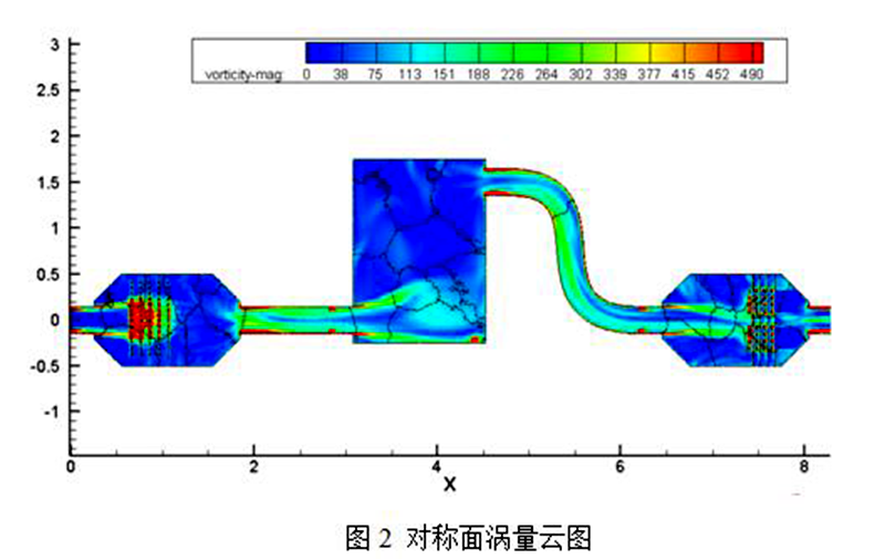 圖2為加入光催化材料后,光催化模塊在入口流量5000m3/h、150°C時的動力學(xué)模擬結(jié)果,通過速度、渦流等流場特性,證明在第一排光催化材料前形成了較為均勻的速度場和密度場,氣流穿過第一排光觸媒網(wǎng)后均勻向后流動。