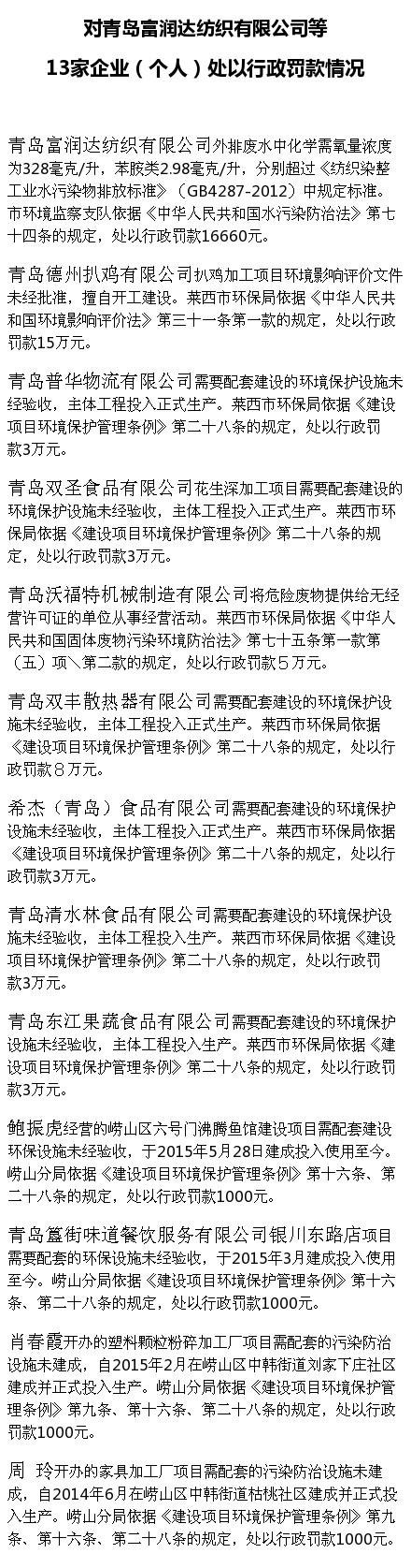 ??????? 9月11日下午,青島市環(huán)保局官方微博公布了對(duì)13家違規(guī)生產(chǎn)企業(yè)(個(gè)人)的處以行政罰款情況,這13家企業(yè)分別是青島富潤(rùn)達(dá)紡織有限公司、青島德州扒雞有限公司、青島普華物流有限公司、青島雙圣食品有限公司、青島沃福特機(jī)械制造有限公司 青島雙豐散熱器有限公司、希杰(青島)食品有限公司、青島清水林食品有限公司、青島東江果蔬食品有限公司、鮑振虎經(jīng)營(yíng)的嶗山區(qū)六號(hào)門(mén)沸騰魚(yú)館、青島簋街味道餐飲服務(wù)有限公司銀川東路店 肖春霞開(kāi)辦的塑料顆粒粉碎加工廠 周玲開(kāi)辦的家具加工廠。