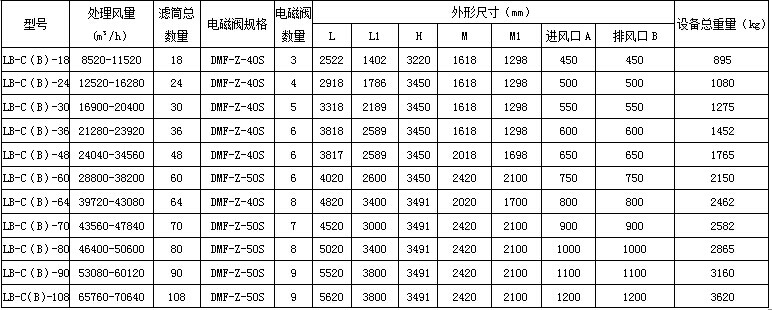 四、防爆式多濾筒除塵器規(guī)格表: