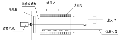 本裝置中旋轉(zhuǎn)式、帶自動(dòng)清洗的空氣過濾器結(jié)構(gòu)原理如下:。